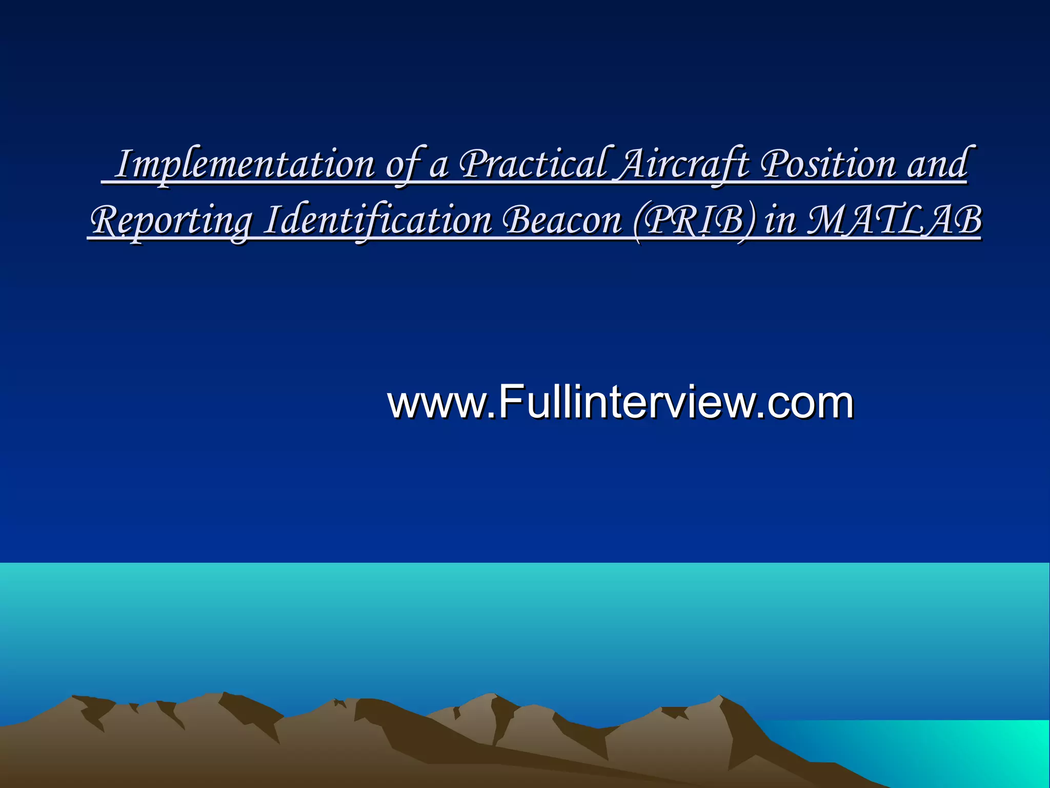 This document discusses the implementation of an aircraft position and identification tracking system using GPS and a PRIB (Practical Aircraft Reporting Identification Beacon) device in MATLAB. It describes the need to track aircraft without relying on transponders that can be turned off. The system uses GPS to determine the aircraft's position and GMSK modulation to transmit identification and location data via the PRIB device. MATLAB is used to simulate the system due to its signal processing and communications toolboxes and ability to define custom functions.