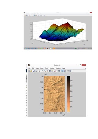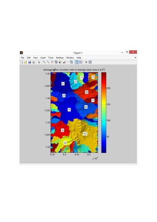 > การทาตารางไล่สีกัน Color bar > บอกค่าความสูงของสีต่างๆ TopoToolbox คือเครื่องมือที่ถูกเขียนขึ้นเพื่อใช้ในการจัดการเชิงพื้นที่ของภูมิประเทศ ในโปรแกรม MATLAB ถูกพัฒนาโดย Schwanghart, Scherler เช่น การดูค่าความสูงจากข้อมูลเชิงเลข Digital elevation Model (DEM) การแบ่งเส้นทางน้าจากค่าความสูง การวิเคราะห์พื้นที่ดินถล่ม (Landslide) เป็นต้น จากนั้นพิมพ์คาสั่ง code DEM = GRIDobj(‘kidchakood.tif’);
