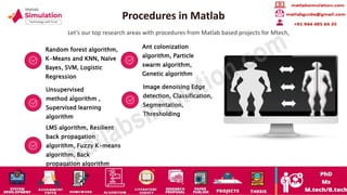 The document discusses MATLAB-based projects for MTech students. It lists popular algorithms used in projects, including random forest, K-means clustering, naive Bayes, and support vector machines. It also mentions common optimization algorithms and unsupervised/supervised learning methods. Example datasets mentioned include satellite images, biometric images, medical images, and PET/CT scans. Finally, it provides examples of recent research topics for projects, such as visual security indexing and convolutional neural networks for fingerprint analysis. Contact details are provided at the end.