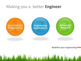 The document outlines a training program for engineers on using MATLAB, detailing its capabilities in algorithm development, data analysis, and visualization among various engineering applications. It explains the MATLAB environment, programming constructs, matrix operations, graphical capabilities, and introduction to the Octave alternative, while also discussing data structures and programming best practices. The training aims to enhance engineers' proficiency in MATLAB for efficient problem-solving in diverse engineering fields.