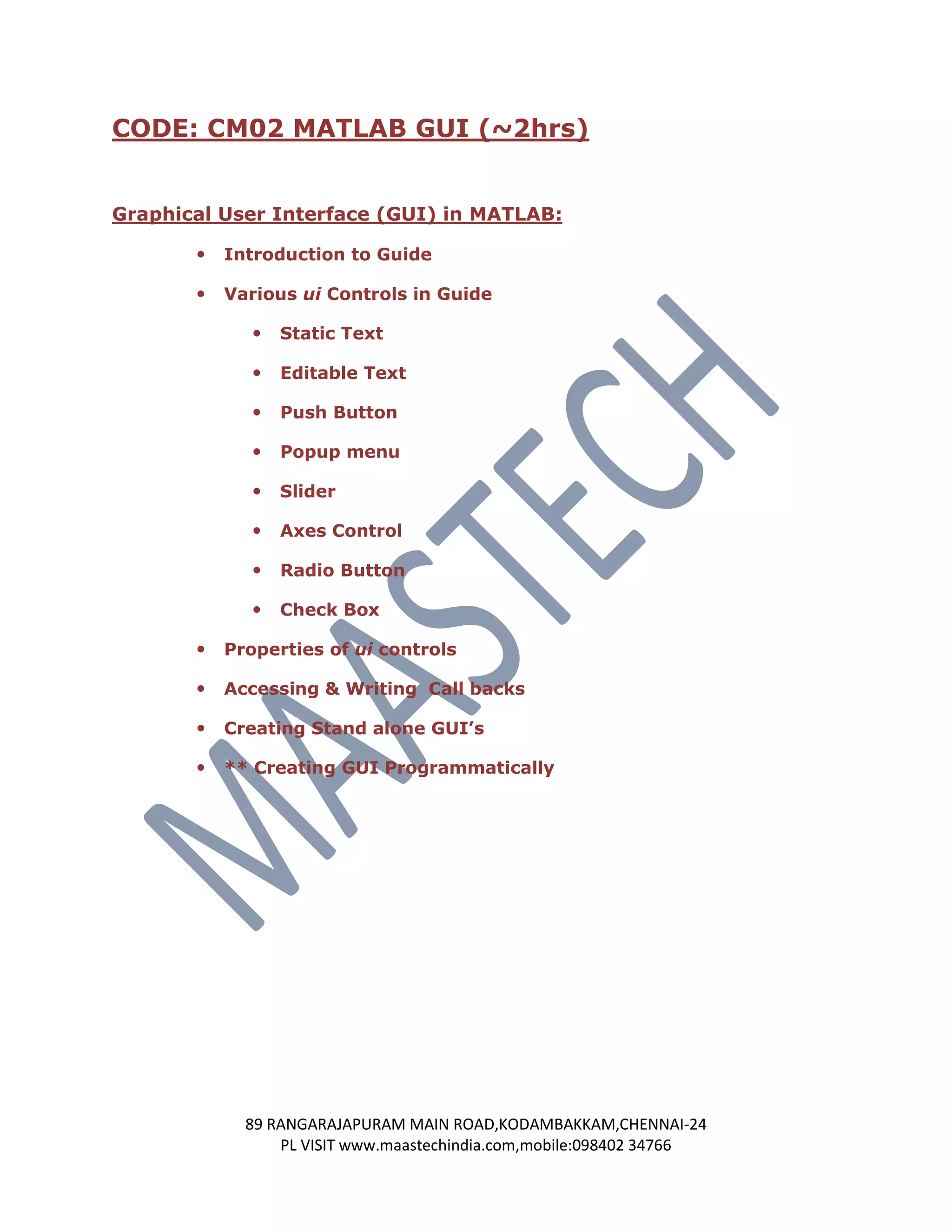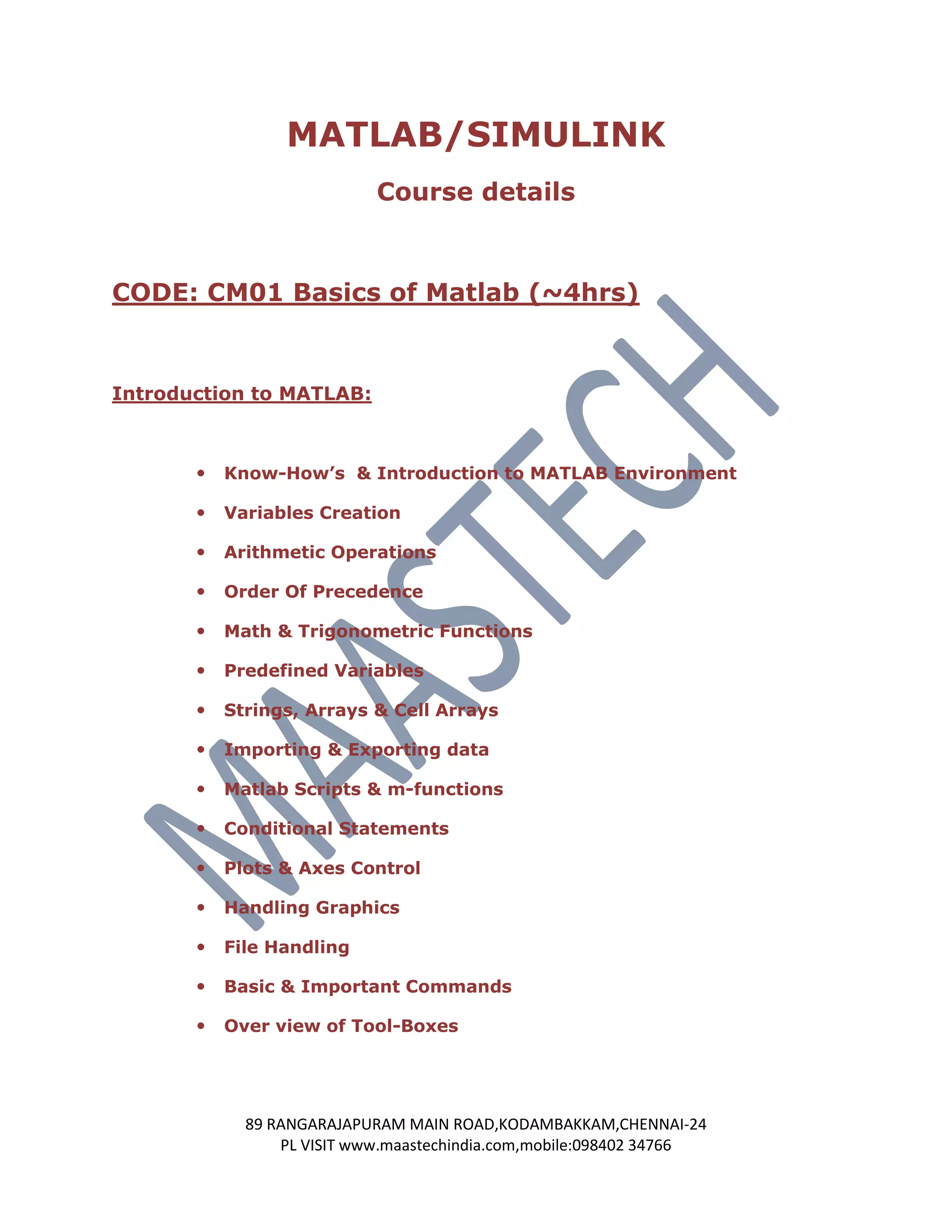 This document outlines various MATLAB and Simulink training courses offered by MAASTECH. It describes 14 different course codes that cover topics such as the basics of MATLAB, GUI development, Simulink modeling, signal processing, image processing, control systems, computer vision, and automotive applications. The courses range from 2-4 hours and will be taught by MATLAB experts from industry. Customized training modules can also be provided based on individual requests. Contact information is provided to learn more about the MATLAB training details.