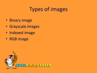 The document discusses different types of images in Matlab including binary, grayscale, indexed, and RGB images. It also summarizes commands to convert between image types such as converting grayscale to indexed or truecolor to binary. Finally, it provides examples of how to view images, measure pixel values and distances, and crop images using the imtool command.