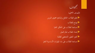 يتناول هذا المستند أهداف وغايات التعلم الذاتي والطرق التي يمكن من خلالها قياس وتحقيق هذه الأهداف لدى الطلاب. يتطرق أيضًا إلى أهمية التخطيط التعليمي وأساليب تقييم الفهم والتفاعل بين الطالب والمعلم. المستند يعرض كذلك علاقات بين الأهداف التعليمية والتفكير النقدي وكيفية تطوير المهارات العاطفية والمعرفية للطلاب.