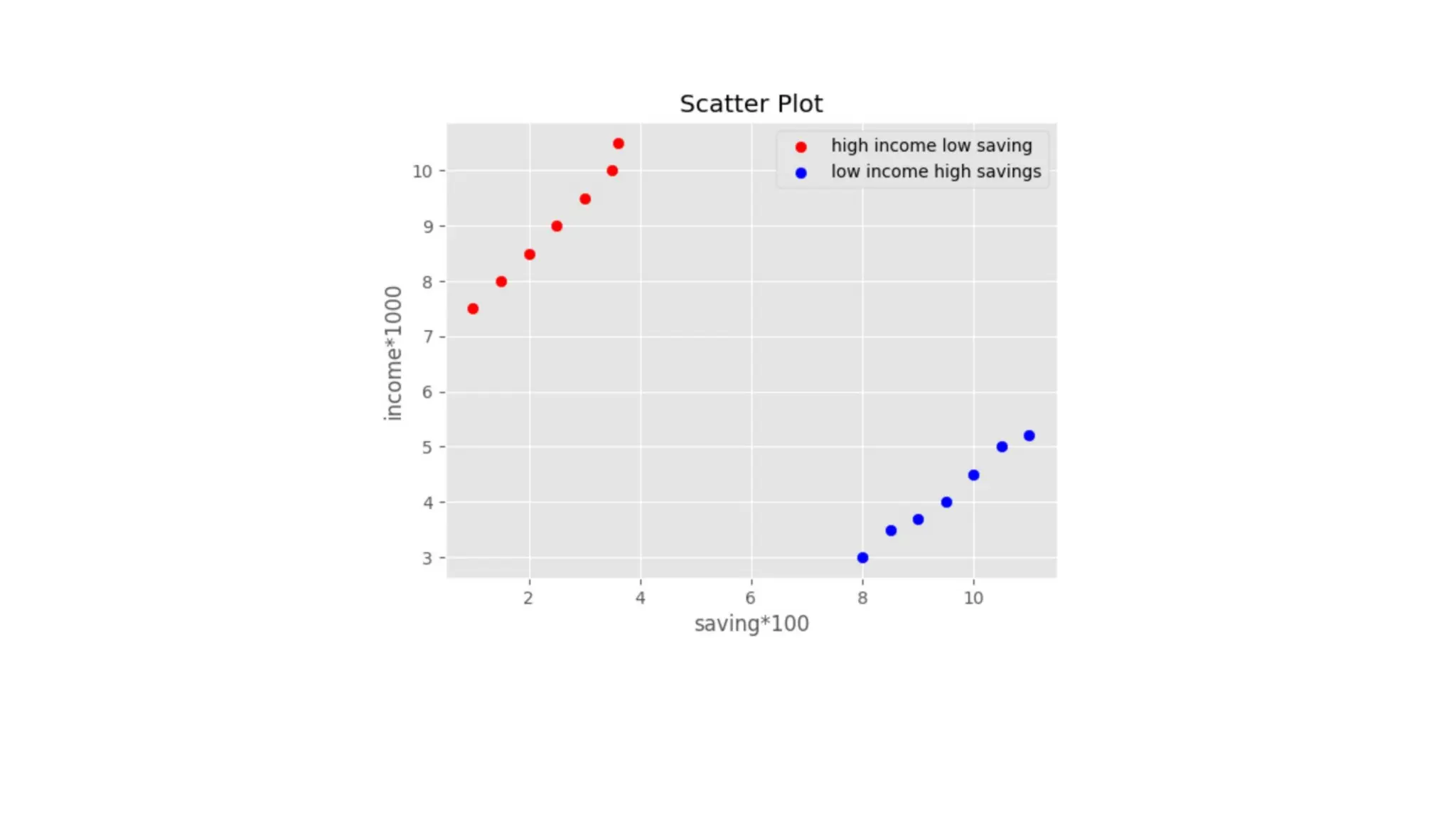 plt.scatter(x,y, label='high income low saving',color='r’) #1st