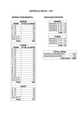 Il documento fornisce una panoramica della distribuzione degli studenti nelle diverse classi dell'istruzione infantile e fondamentale per l'anno 2011. Complessivamente, include 1008 iscrizioni nel settore dell'istruzione fondamentale e 125 nel settore dell'educazione infantile, per un totale di 1133 studenti. Viene anche specificato il numero di alunni per ciascuna classe e per ciascun turno.