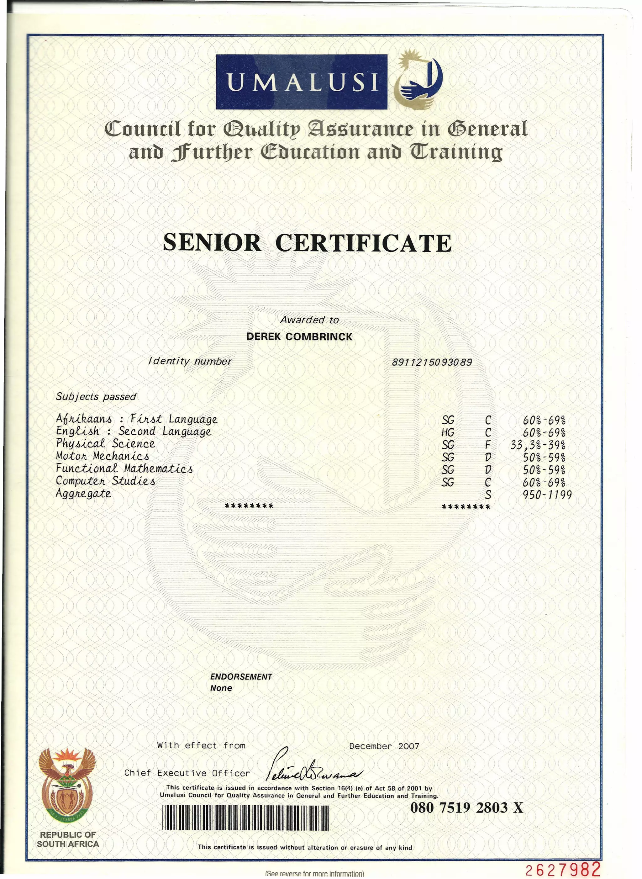 This document is a certificate issued by Umalusi Council for Quality Assurance in General and Further Education and Training. It certifies that the subject passed various subjects, achieving scores ranging from 50-69% in some subjects and 33.3-39% in another. The certificate does not have any endorsements and was issued in December 2007.