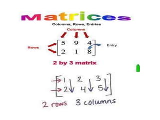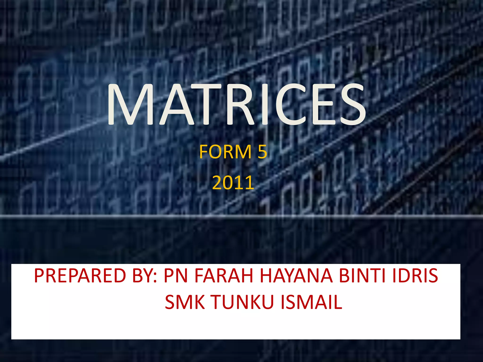 This document is a mathematics form on matrices that covers 7 objectives: understanding matrix concepts; equal and not equal matrices; addition and subtraction of matrices; multiplication of matrices; identity matrices; inverse matrices; and solving simultaneous equations using matrices. Examples are provided for each objective to illustrate key concepts and procedures related to matrices.