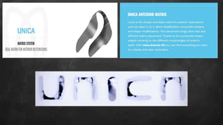 2. Matrices: Devices that create a temporary wall for dental restorations when tooth structure is missing. Various matrix types exist for different cavity classes, including Tofflemire matrices for Class II cavities, shaped strips for Class III/IV, and window matrices for Class V. Matrices are made of materials like metal, cellophane or mylar and aim to confine