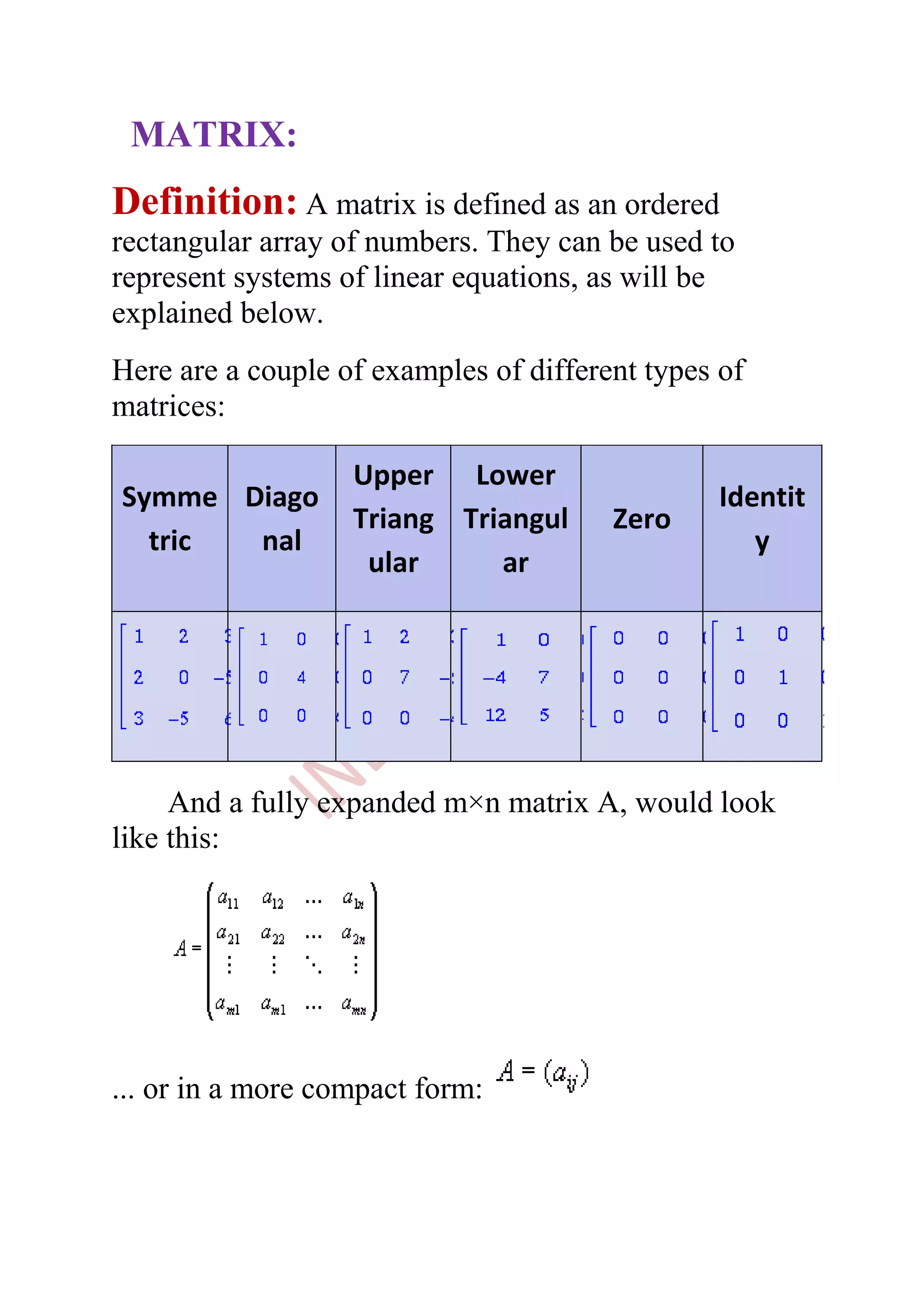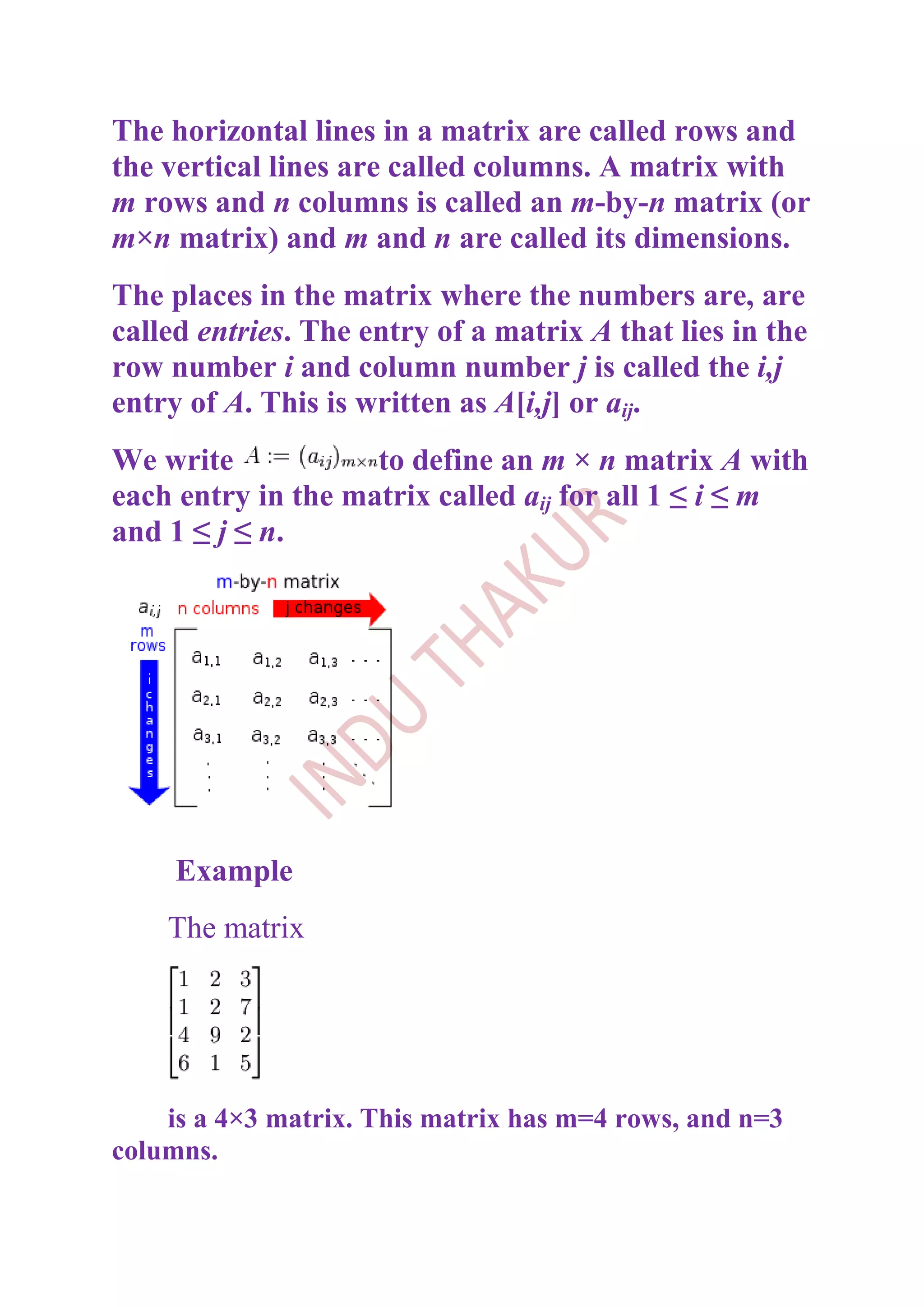The document defines matrices and provides examples of different types of matrices. It discusses key concepts such as rows, columns, dimensions, entries, addition, subtraction, and multiplication of matrices. It also covers special matrices like identity matrices, inverse matrices, transpose of matrices, and using matrices to solve systems of linear equations. The document is a comprehensive overview of matrices that defines fundamental terms and concepts.