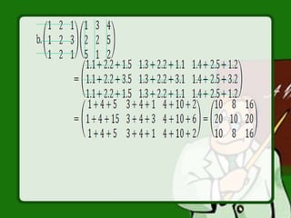 Dokumen ini menjelaskan tentang matriks untuk siswa kelas XII IPA, mencakup definisi, jenis-jenis matriks, dan operasi aljabar matriks seperti penjumlahan, pengurangan, dan perkalian. Siswa diajarkan untuk mengenal sifat matriks, termasuk transpose dan kesamaan matriks. Selain itu, terdapat juga penjelasan tentang determinan matriks dan kuis untuk menguji pemahaman siswa.