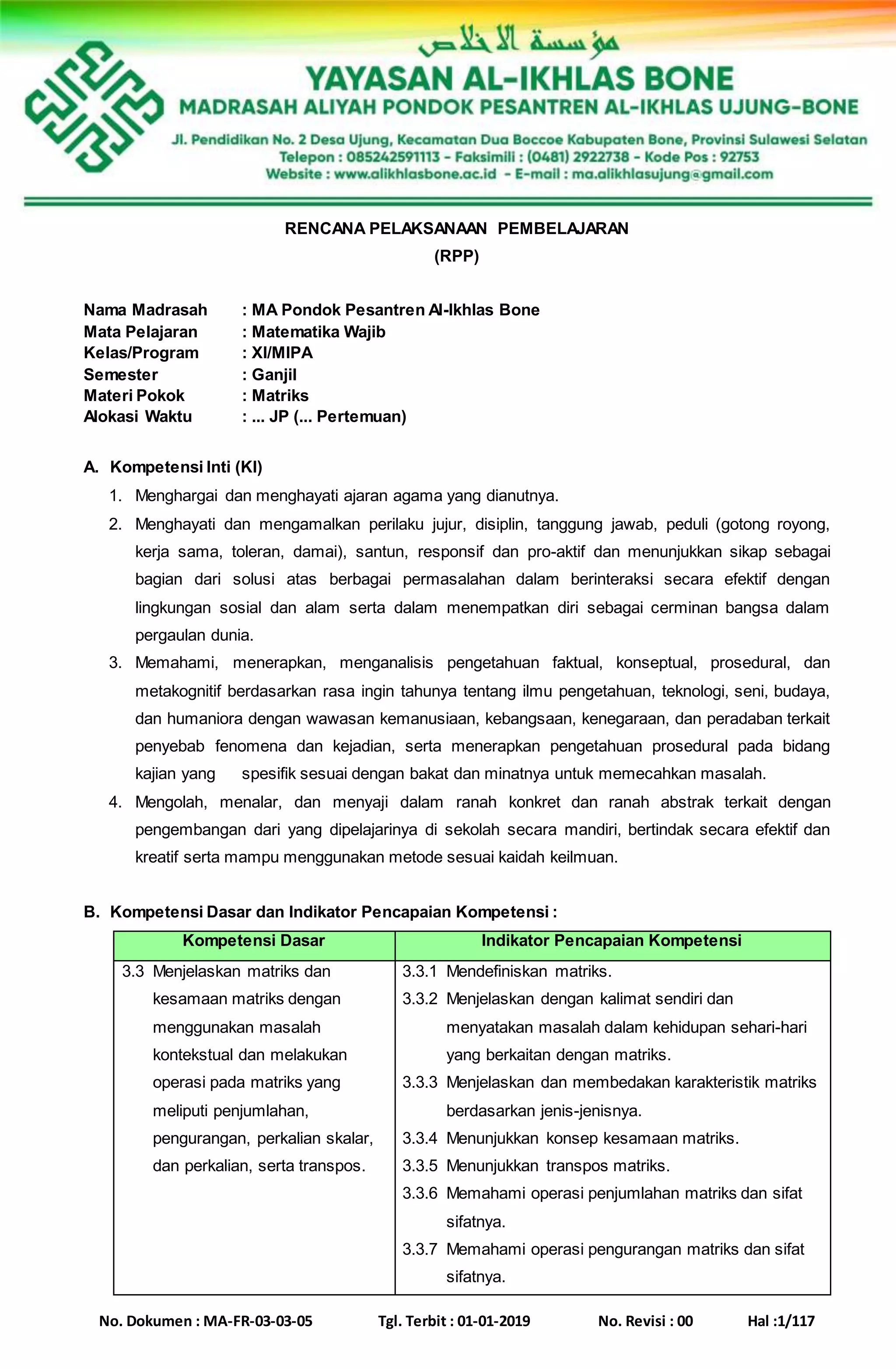 Rencana Pelaksanaan Pembelajaran (RPP) ini membahas tentang materi matriks pada kelas XI MIPA. RPP ini menjelaskan kompetensi inti, kompetensi dasar, indikator pencapaian kompetensi, tujuan pembelajaran, dan materi pembelajaran tentang matriks yang mencakup pengertian matriks, jenis matriks, transpos matriks, kesamaan matriks, operasi penjumlahan dan pengurangan matriks, perkalian