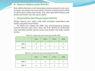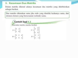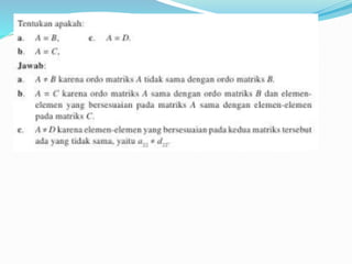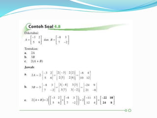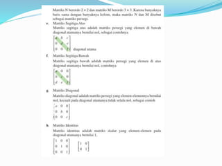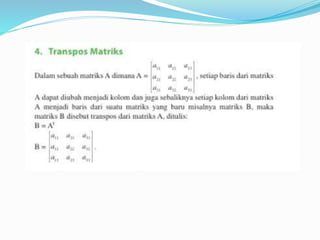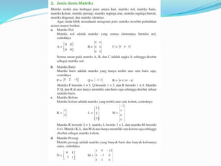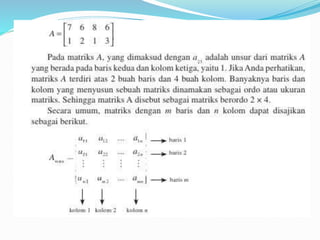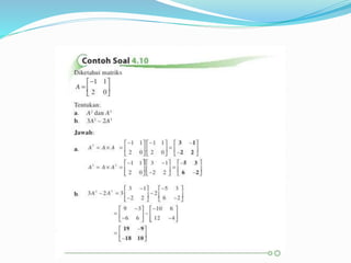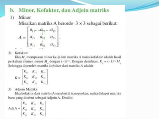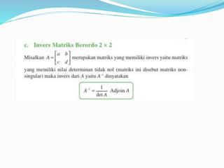 Dokumen ini menjelaskan konsep dasar matriks, termasuk definisi, perkalian skalar, perkalian matriks, dan perpangkatan matriks. Selain itu, dokumen ini membahas tentang determinan dan invers matriks, menjelaskan cara menghitung determinan untuk matriks 2x2 dan 3x3, serta pentingnya invers dalam aljabar matriks. Informasi ini disampaikan oleh kelompok yang terdiri dari lima anggota.