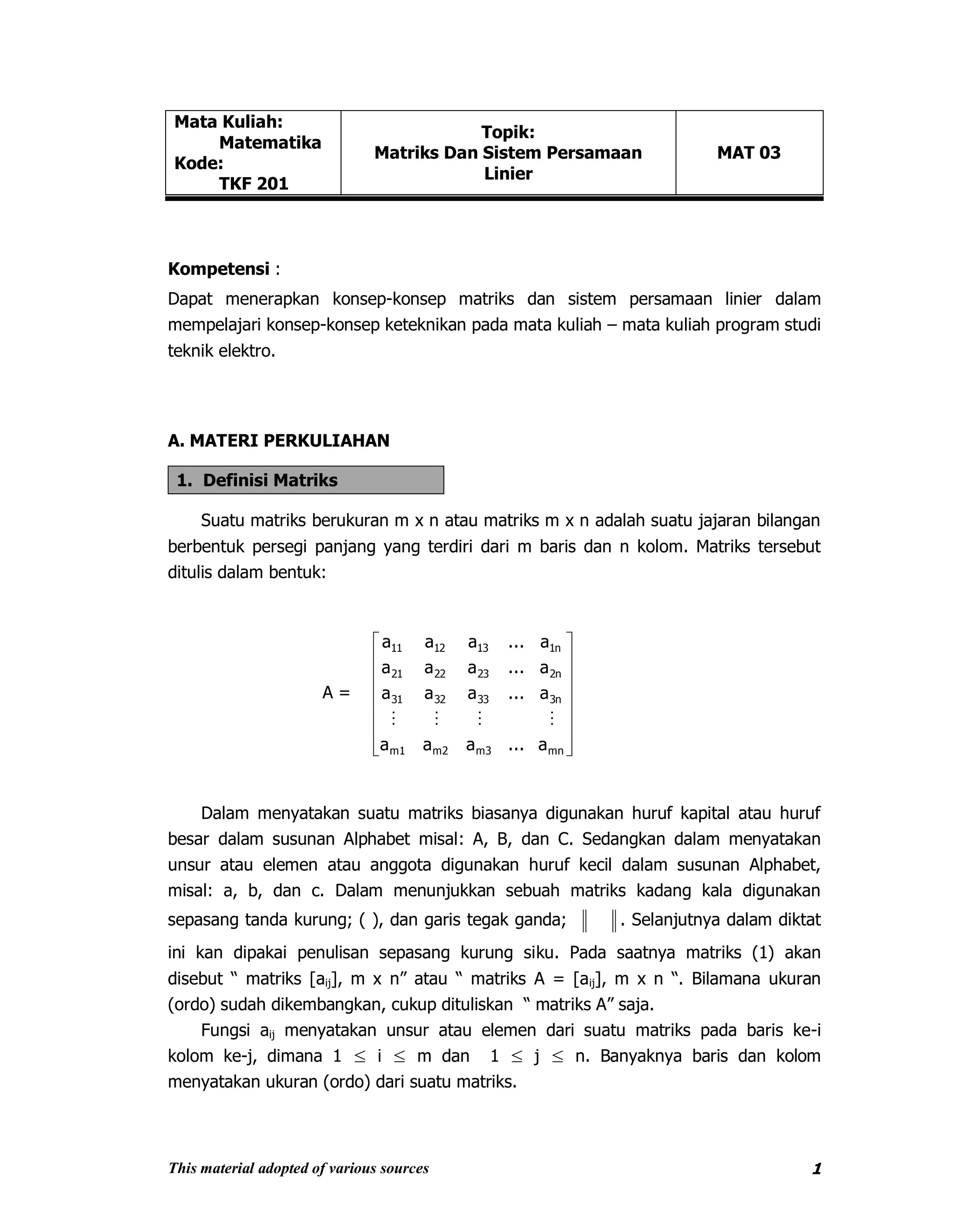 Dokumen tersebut membahas tentang materi perkuliahan matriks dan sistem persamaan linier. Materi ini mencakup definisi matriks, jenis-jenis matriks seperti matriks bujur sangkar dan matriks segitiga, operasi aljabar pada matriks seperti penjumlahan dan perkalian matriks, serta penentuan determinan matriks bujur sangkar.