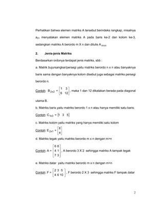 Matriks adalah susunan bilangan yang disusun secara sistematis dalam baris dan kolom. Terdapat berbagai jenis matriks seperti matriks persegi, matriks tegak, dan lainnya. Operasi dasar pada matriks meliputi penjumlahan, pengurangan, dan sifat-sifatnya seperti komutatif dan asosiatif.