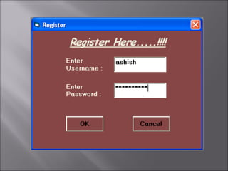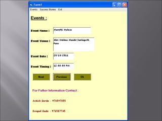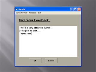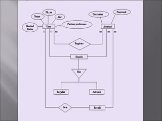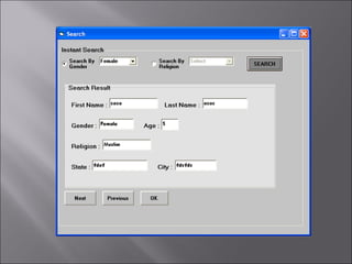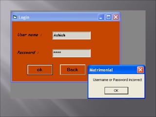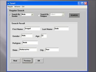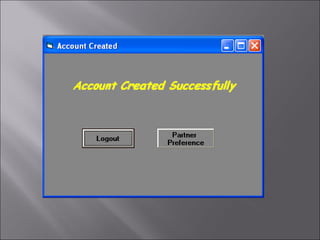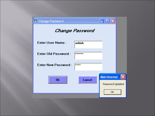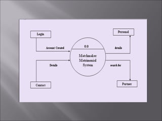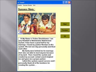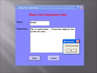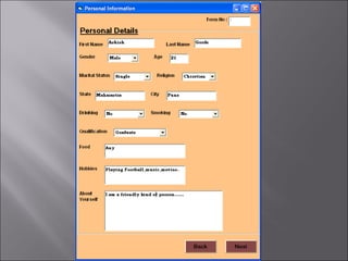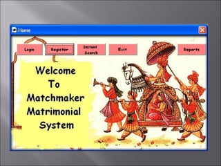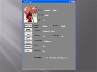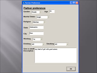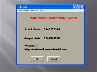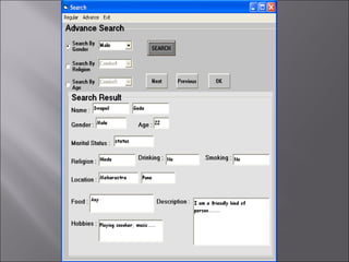 The document describes a matchmaking matrimonial system project created by students. The system allows individuals to create profiles, search for partners based on their preferences, and view detailed profiles of other users. It was designed to address limitations of manual matchmaking systems by providing an online database accessible from any location. The project uses VB6 for the front end, Microsoft Access for the back end database, and can run on Windows XP. It includes forms to collect and display user profiles and allows photo uploads. While simple to use, it has limitations such as supporting a small user base and experiencing slower search times.