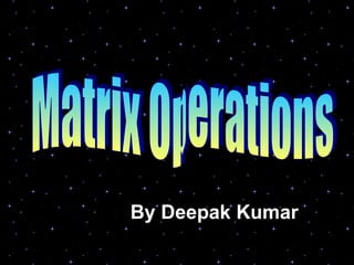 A matrix is a rectangular arrangement of numbers in rows and columns. To add or subtract matrices, they must have the same order (same number of rows and columns) and the corresponding entries are added or subtracted. To multiply a matrix by a scalar, each entry in the matrix is multiplied by the scalar number.