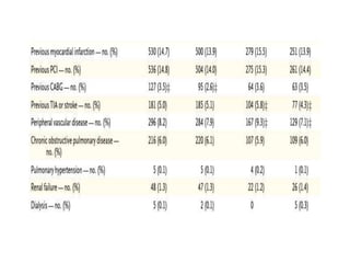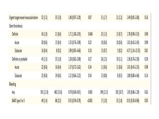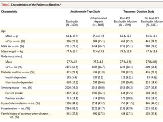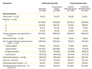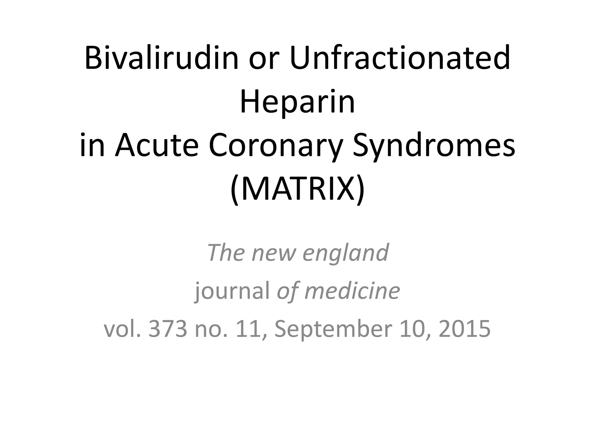 This document summarizes the MATRIX study which compared the effectiveness of bivalirudin versus unfractionated heparin in patients with acute coronary syndromes undergoing invasive treatment. The study included two randomized trials involving over 7,000 patients total comparing the drugs. At 30 day follow up, major adverse cardiovascular events occurred in 10.3% of the bivalirudin group versus 10.9% of the heparin group, showing bivalirudin was not superior to heparin for reducing ischemic outcomes while potentially reducing bleeding risks.