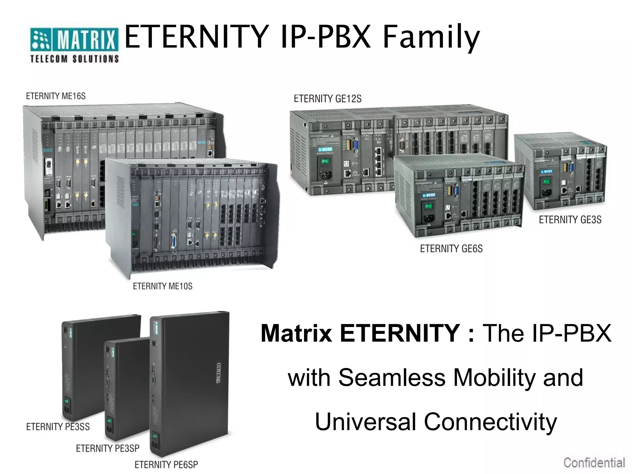The document describes the Matrix ETERNITY PE, an enterprise-grade IP-PBX for businesses. The ETERNITY PE comes in various models with different port capacities. It supports a wide range of interfaces including analog, digital, VoIP, and wireless interfaces. The system provides rich features and is highly scalable and flexible. It can be used for applications such as IP-PBX, hospitality PBX, and universal gateway solutions.