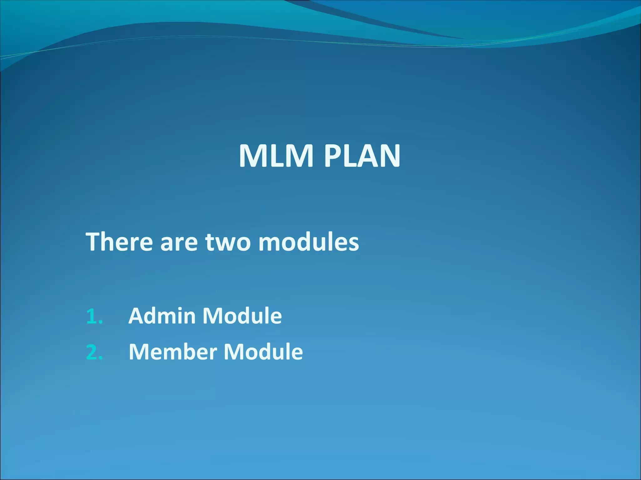 The document outlines a multi-level marketing (MLM) plan with two modules: an admin module and a member module. The admin module includes settings for managing franchise details, registrations, pin management, payouts, and news management, while the member module allows users to view and edit profiles, manage their networks and accounts, track pins, and request awards. Overall, the structure facilitates the administration and operation of the MLM system for both administrators and members.