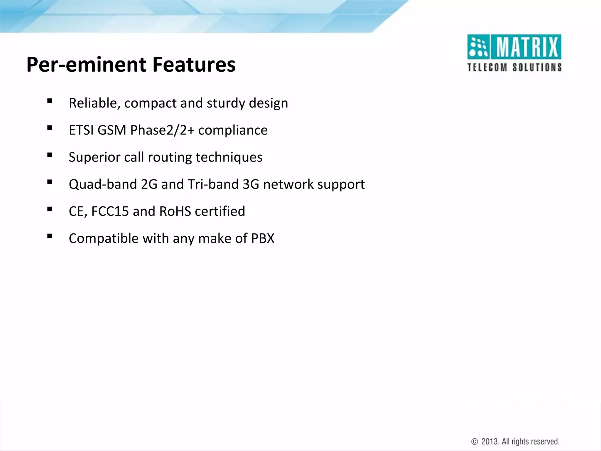 The document provides an overview of the Simado GFX44, a multi-port GSM/3G-FXS gateway designed for small to mid-sized businesses, featuring reliable design and various call routing techniques. It offers extensive functionality, including call detail recording, emergency dialing, network selection, and programmable settings for cost-effective communication. Certifications include ETSI GSM compliance and RoHS, making it compatible with various PBX systems and suitable for diverse applications.