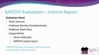 The Matsiti evaluation interim report focuses on increasing the representation, capacity, and retention of Aboriginal and Torres Strait Islander teachers in schools. Preliminary findings indicate some strategies have potential merit but face challenges due to cultural safety and data accuracy, while substantial support at various government levels is needed for future reforms. The report includes recommendations for continued national strategies and improved regulatory measures to support Indigenous teacher identification and professional development.