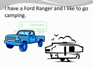 This short document discusses an individual's interests which include camping in their Ford Ranger, enjoying Chinese food, and playing baseball.