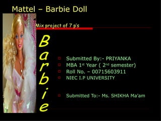 This document discusses the marketing mix of Barbie dolls. It provides an overview of the history and introduction of Barbie, which was first launched in 1959. It then covers the 7 P's of the marketing mix for Barbie: product, price, promotion, place, process, people, and physical evidence. For each P, it gives details on Barbie's product line, pricing strategies, promotional activities including celebrity endorsements, distribution channels both online and offline, manufacturing processes, and packaging.