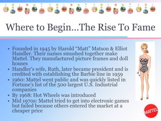 Founded in 1945, Mattel became a publicly traded company in 1960 known for iconic brands like Barbie and Hot Wheels. In the late 1990s and 2000s, Mattel struggled financially and competitively but was able to turn things around in the late 2000s by improving operations and focusing on core brands. Today, Mattel aims to create the future of play through innovation while maintaining its position as a leader in the toy industry.