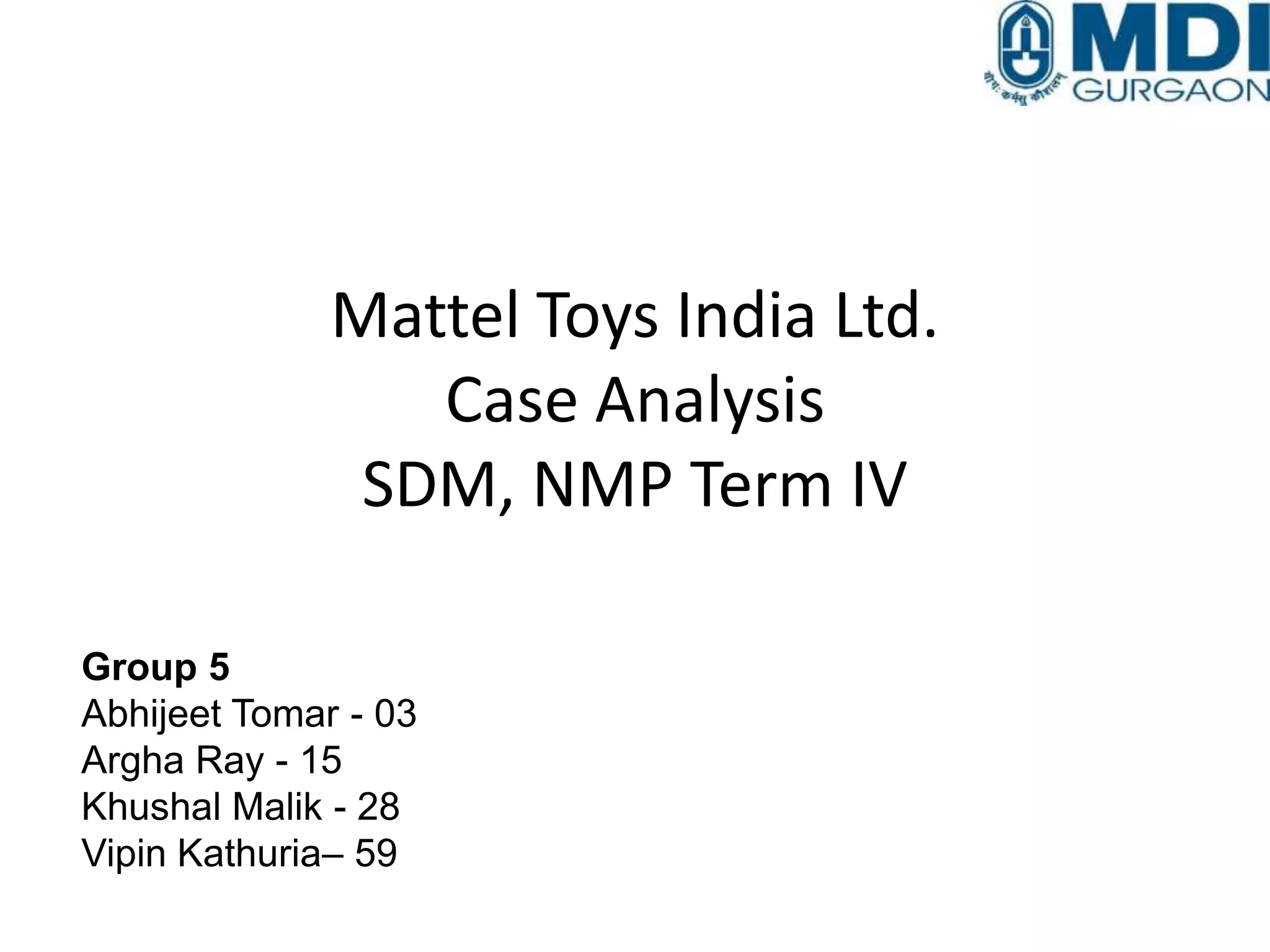 This document analyzes Mattel Toys India's distribution strategy and challenges in the Indian market. It discusses Mattel's previous strategies that led to inventory issues and retailer unhappiness due to margin differences compared to unorganized competitors. Mattel's new strategies brought initial sales growth but also unease among distributors due to reduced margins and the introduction of wholesalers. The document concludes Mattel must properly profile retailers, ensure all channel margins are equitable, only promote competent managers, and rethink its distribution channel strategy.