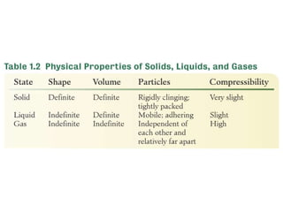 1. Matter can exist in different physical states such as solids, liquids, and gases which are determined by factors like the strength of attractive forces between particles and their ability to be compressed.