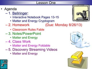 Energy and matter make up the universe. Matter is anything that has mass and takes up space, and most of the universe is made of matter. Energy is the part of the universe that is not matter, and it does not have mass or take up space. Energy affects matter by making it change, move, and do work. Students reviewed these key concepts about matter and energy through interactive notebook activities, videos, and discussion.