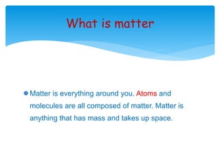Matter is anything that has mass and takes up space. There are three states of matter: solids have a definite shape and volume with particles close together and fixed; liquids have an indefinite shape but definite volume, taking the shape of their container with mobile but close particles; gases have an indefinite shape and volume, taking the shape and volume of their container with particles far apart and moving. Properties of matter include physical properties which are observed without changing the substance like color, shape, or boiling point, and chemical properties which are only observed when a substance interacts with another like flammability or rusting. Basic kinds of matter are elements, compounds, and mixtures.