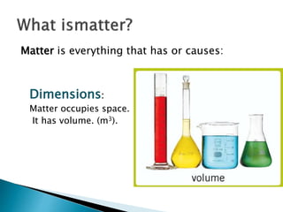 Matter is everything that occupies space and has mass. It has properties including dimensions, inertia, and gravitational attraction. Mass indicates an object's inertia and is measured in kilograms, while weight depends on gravity and is measured in newtons. An object's mass stays the same regardless of location, but its weight can change depending on the gravitational pull.