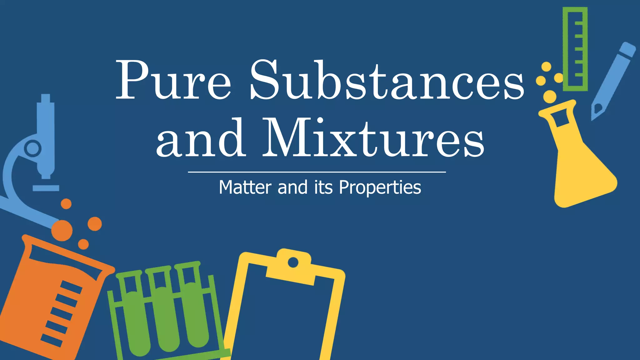Pure substances are made of only one type of atom or molecule, and can be elements or compounds. Mixtures contain two or more substances mixed but not chemically combined. Mixtures can be homogeneous, containing a uniform composition, or heterogeneous, where the composition varies. Separation techniques like filtration, evaporation, distillation, and decantation are used to separate mixtures based on differences in their physical properties.