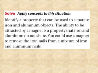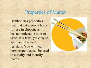 1. The document discusses various properties of matter and how they are used to classify and identify different types of matter. It describes extensive properties that depend on amount and intensive properties that depend on type.