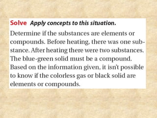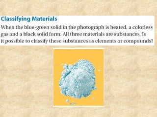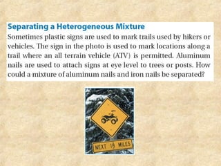 2. Mixtures and pure substances are introduced. Heterogeneous mixtures are non-uniform while homogeneous mixtures are uniform throughout. Elements have a unique set of properties while compounds contain two or more elements.