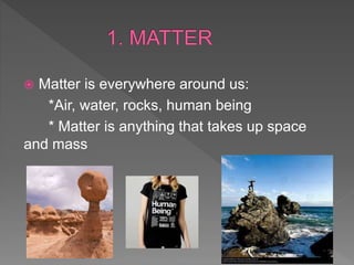 Matter is anything that takes up space and has mass. All matter has certain characteristics including mass, which is the amount of matter an object contains, and volume, which is the space an object occupies. Matter also has properties like hardness, brittleness, elasticity, and density. Forces are interactions between bodies that can start or change the motion of an object by increasing, decreasing, or changing the direction of its speed. Different materials like plastic, elastic, and brittle substances change shape or properties like thermal conductivity, transparency, and impermeability differently when forces act on them. Common materials we use include clay, plastic, copper, windows, wood, ceramics, and concrete.