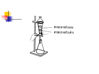 การสกัดด้วยตัวทาละลาย การสกัดด้วยตัวทาละลายจะใช้หลักการที่ว่าสารแต่ละ ชนิดมีความสามารถในการละลายในตัวทาละลายต่างชนิดกัน ได้ไม่เท่ากัน