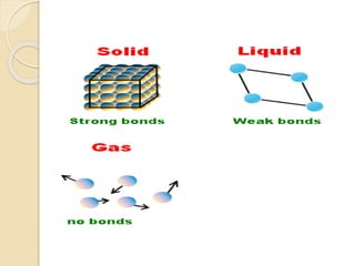 The document discusses the key properties and characteristics of matter. It defines the three main states of matter as solids, liquids, and gases, noting their defining physical properties like shape, volume, and molecular bonding. It also discusses physical and chemical changes, providing examples of each type of change and the forces involved. Finally, it outlines various material properties including resistance, flexibility, transparency, and abilities to conduct or insulate heat.