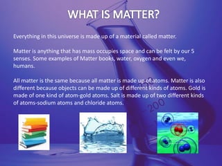 Matter is defined as anything that has mass, occupies space, and can be perceived through the senses, consisting of atoms which can be of various types. Particles of matter have specific properties such as the presence of space between them, continuous movement, and the ability to attract each other, which are demonstrated through various proofs. Matter exists in five states—solid, liquid, gas, plasma, and Bose-Einstein condensate—and can change states due to temperature variations.
