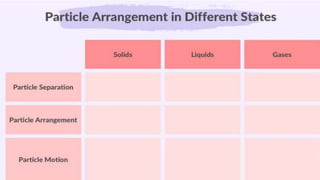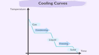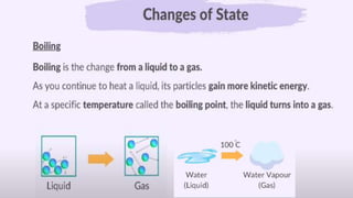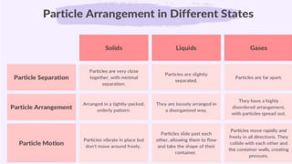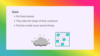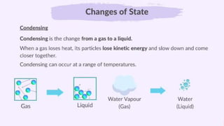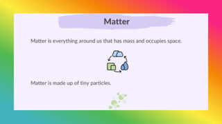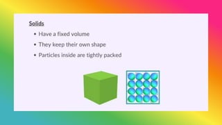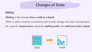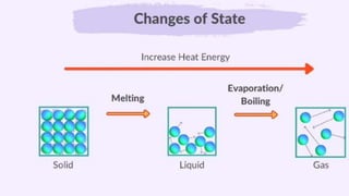 This document discusses the three main states of matter - solid, liquid, and gas - and how changes between these states occur through physical processes involving heat. It also examines factors like temperature that can cause materials to transition between different states of matter, and defines diffusion as a property specific to liquids and gases where particles can spread out and mix.