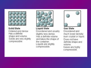 Matter comes in four forms: solids have a definite shape and volume, liquids have a definite volume but not shape, gases have no definite shape or volume, and plasmas are charged particles with no definite shape or volume. The document introduces the basic properties and states of matter, including solids, liquids, gases, plasmas, atoms, and examples of things made of plasma like flames, nebulae, and stars.