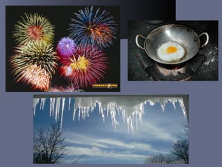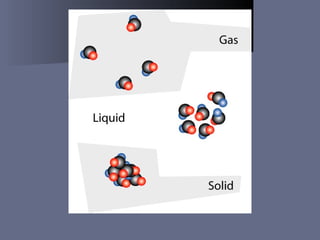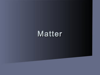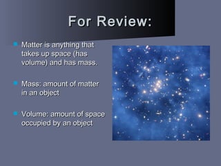 The document defines matter as anything that takes up space and has mass. It describes the three common states of matter - solids, liquids, and gases - based on how tightly or loosely packed the atoms are and how they move. Physical properties can be observed without changing a substance's identity, while chemical properties involve changing its identity through a chemical reaction. Physical changes alter a substance's properties but not its chemical makeup, while chemical changes produce different substances. Mixtures are combinations of two or more substances that can often be separated using physical properties like density, solubility, or melting/boiling points.