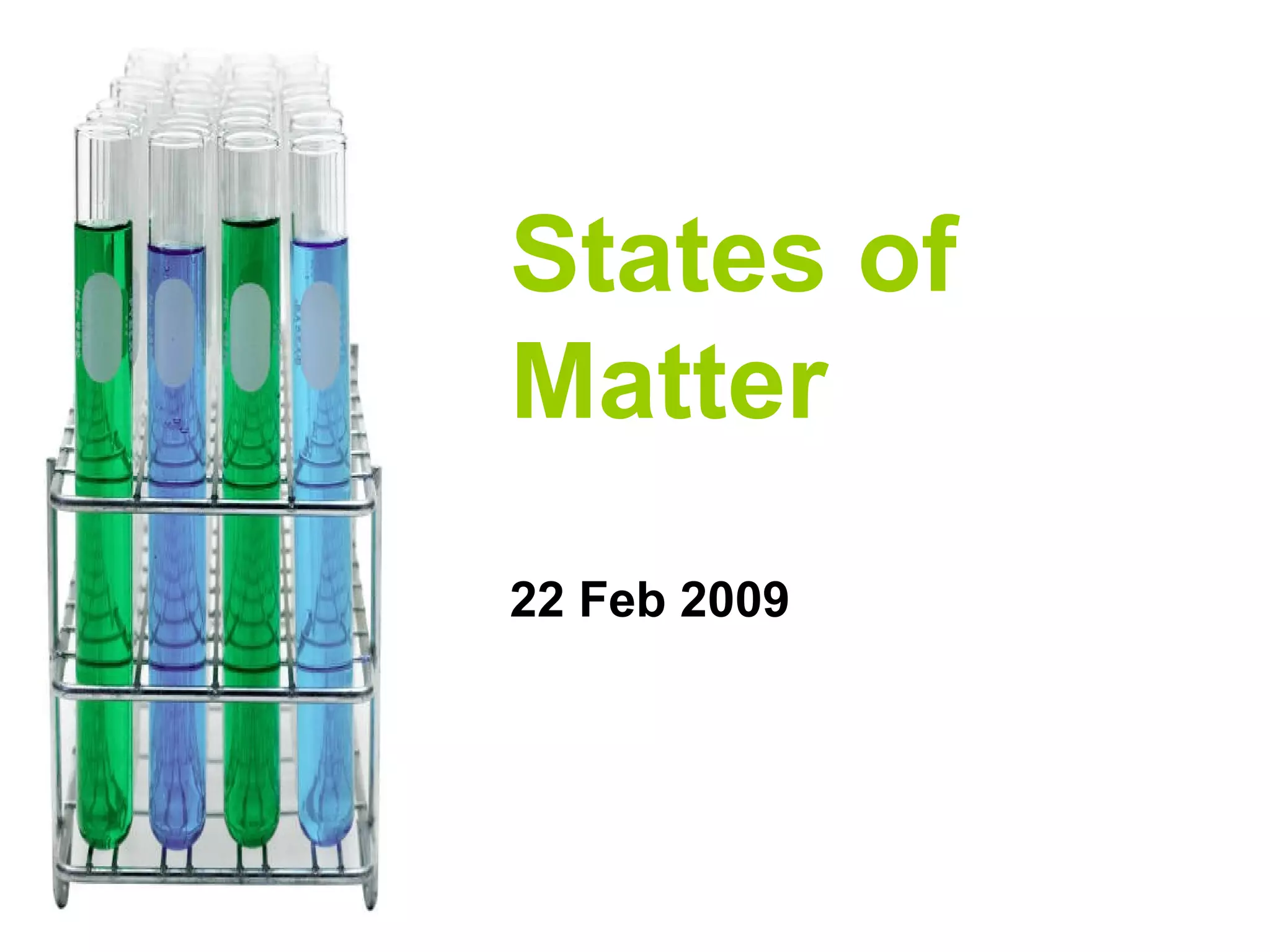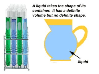 Matter can exist in three states: solid, liquid, and gas. Solids have a definite shape and volume. Liquids have no definite shape but a definite volume, taking the shape of their container. Gases have no definite shape or volume, filling their container completely and being compressible. The document provides examples like butter, wax, and sponges to illustrate how different substances can exist in more than one state.