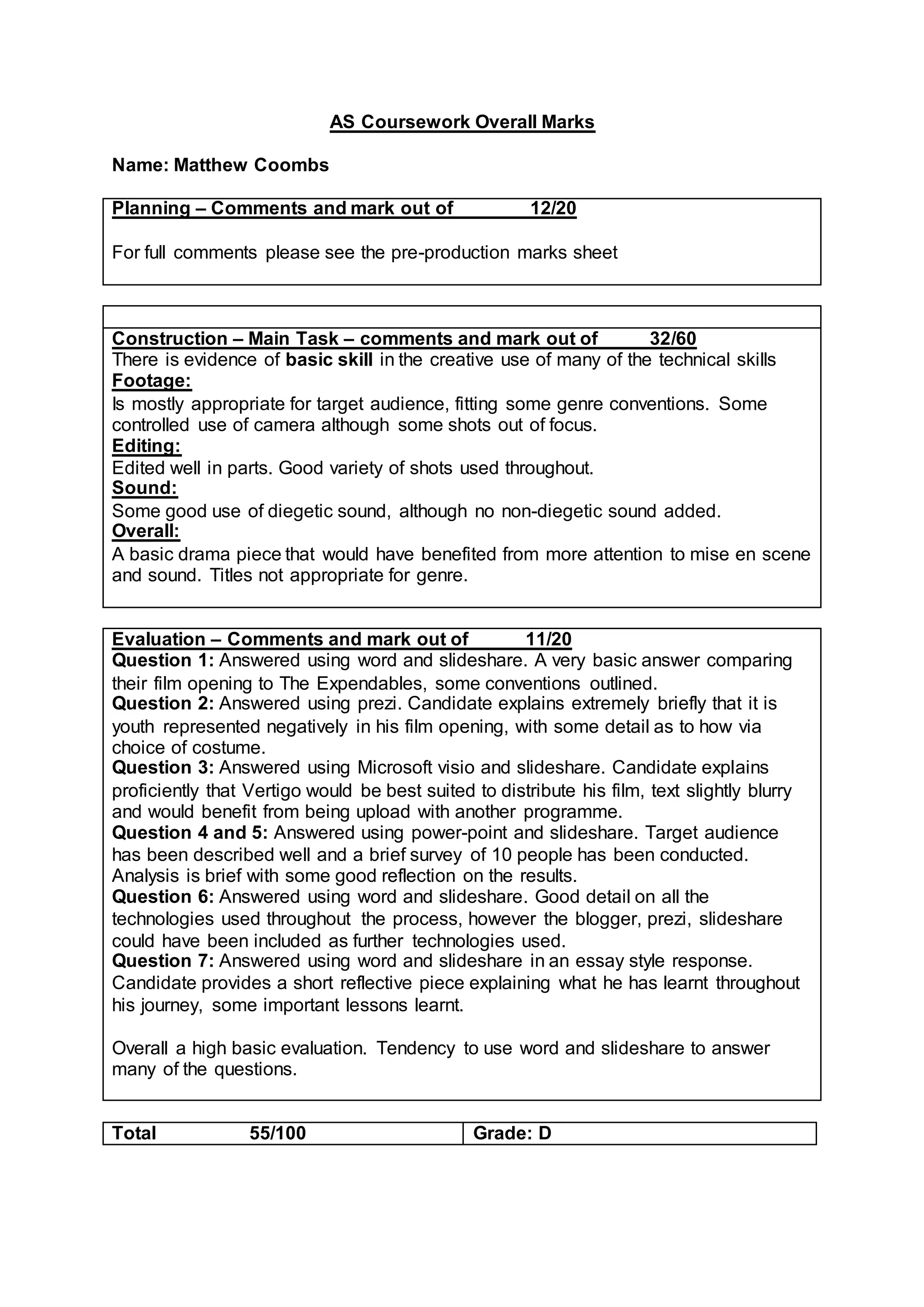 Matthew Coombs received a grade of D for his AS coursework with an overall mark of 55 out of 100. For the planning stage, he received a mark between 12 and 20 out of 20. For the construction main task, he received a mark of 32 out of 60. The evaluator commented that it was a basic drama piece that could have benefited from more attention to details. For the evaluation questions, he received a mark of 11 out of 20. The evaluator noted that while some answers were good, many relied on word documents and slideshare without fully analyzing or reflecting on the process.