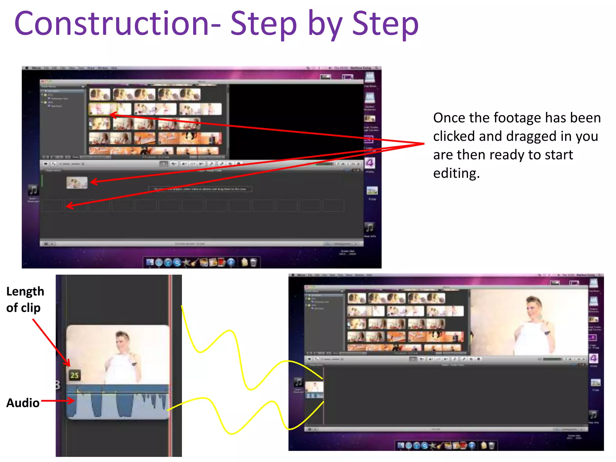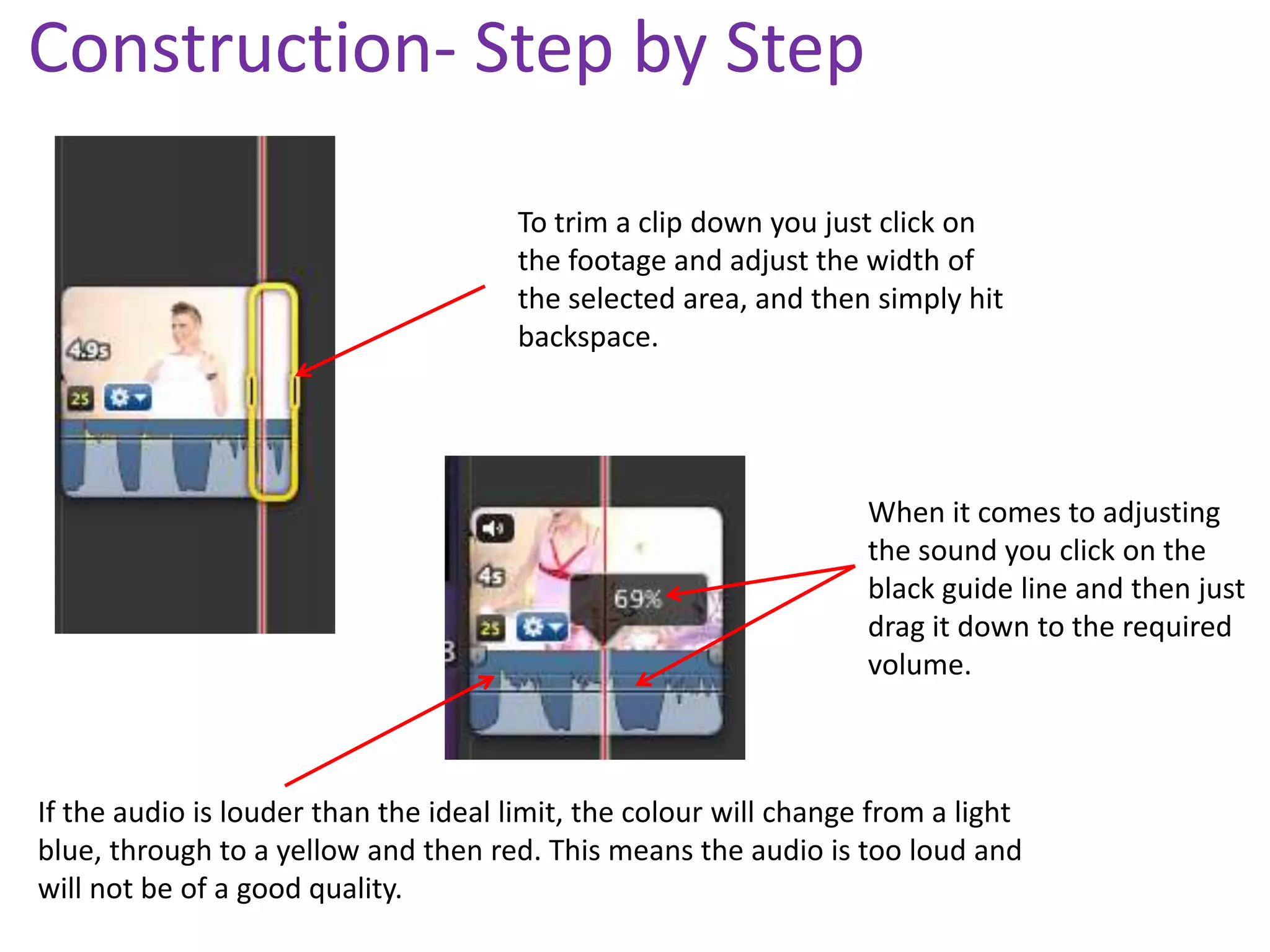 The document provides instructions for editing video clips using editing software. It describes how to trim clips by adjusting the width of the selected area and hitting backspace. It also explains how to adjust audio volume by dragging the audio guide line up or down, and describes splitting clips using the split clip option in the right click menu. The document notes that uploading video to YouTube allows getting an HTML code to embed the video in a blog. It also describes using Slideshare to upload presentations and social media like Facebook, Twitter and YouTube to communicate about projects and gather feedback.
