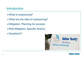Procedures to Mitigate Outsourcing Risk document outlines risks of outsourcing and provides strategies to mitigate those risks. It discusses defining project scope, roles and responsibilities in contracts to prevent issues. It also recommends planning for success with a shared vision and critical success factors. Ongoing risk mitigation includes regular performance reviews, benchmarking, and insurance. Proper planning is needed for demobilization and transition to prevent issues when a contract ends.