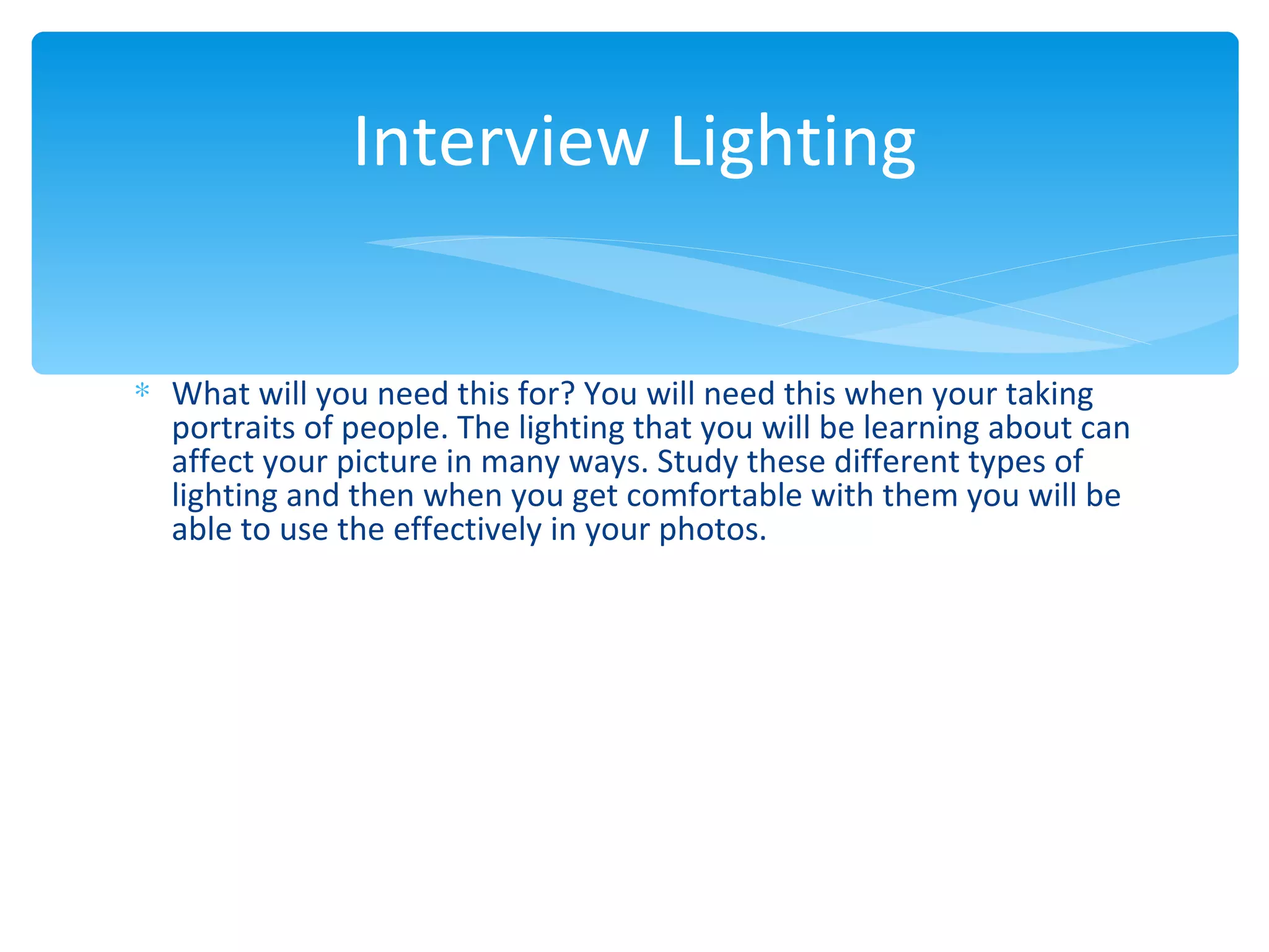The document discusses various types of lighting used for portrait photography, including key light, fill light, hair light, edge light, and background light. It defines each type of lighting and provides techniques for their effective use, such as using a soft or hard key light, reflecting the key light as fill light, and using barn doors or egg crates to control light spill. The goal is to use different lighting setups and techniques to illuminate the subject and create separation from the background.