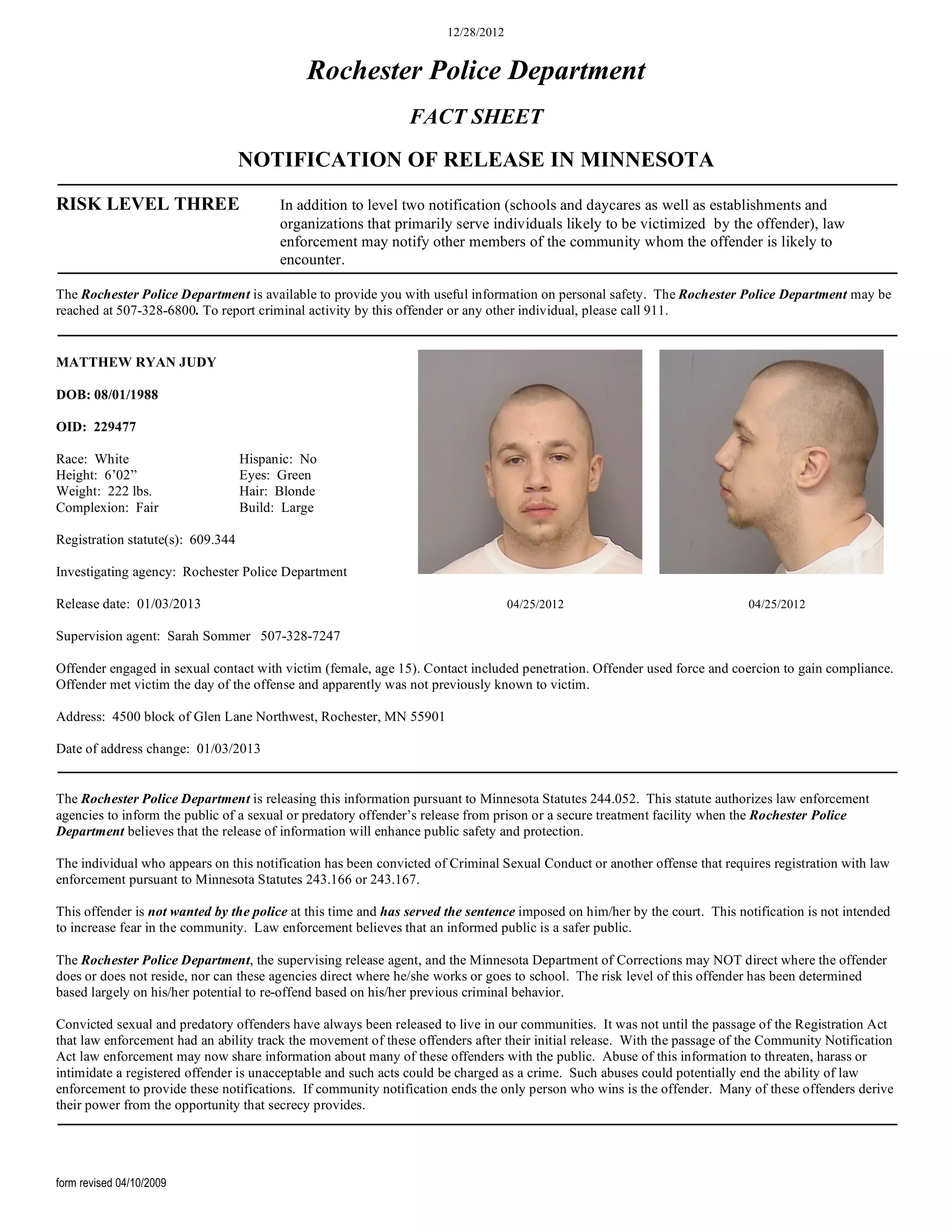 Matthew Ryan Judy, a level three sex offender, is being released from prison on January 3, 2013. He was convicted of criminal sexual conduct for sexually assaulting a 15-year-old female victim through force and coercion. Upon his release, the Rochester Police Department is notifying the community per Minnesota law due to his high risk level of reoffending. His new address will be in the 4500 block of Glen Lane Northwest in Rochester. Community members are advised to be aware but not to threaten or harass the offender.