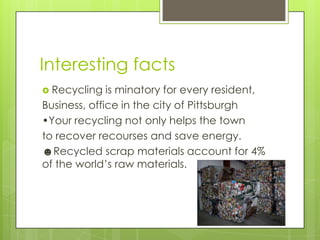 Recycling is mandatory for residents and businesses in Pittsburgh according to the document. Recycling helps recover resources, save energy, and accounts for 4% of the world's raw materials. Most wood, metal, plastic, and minerals consumed in industrial countries are used and discarded, contributing to shrinking forests and climate change. Old recycling products are turned into new ones, and plastic bottles must be carefully sorted by chemical type as recycling goes from collectors to mills to manufacturers to markets. The document pledges to recycle more and reuse plastic bottles, and suggests putting up flyers and a website to spread awareness of recycling's benefits.